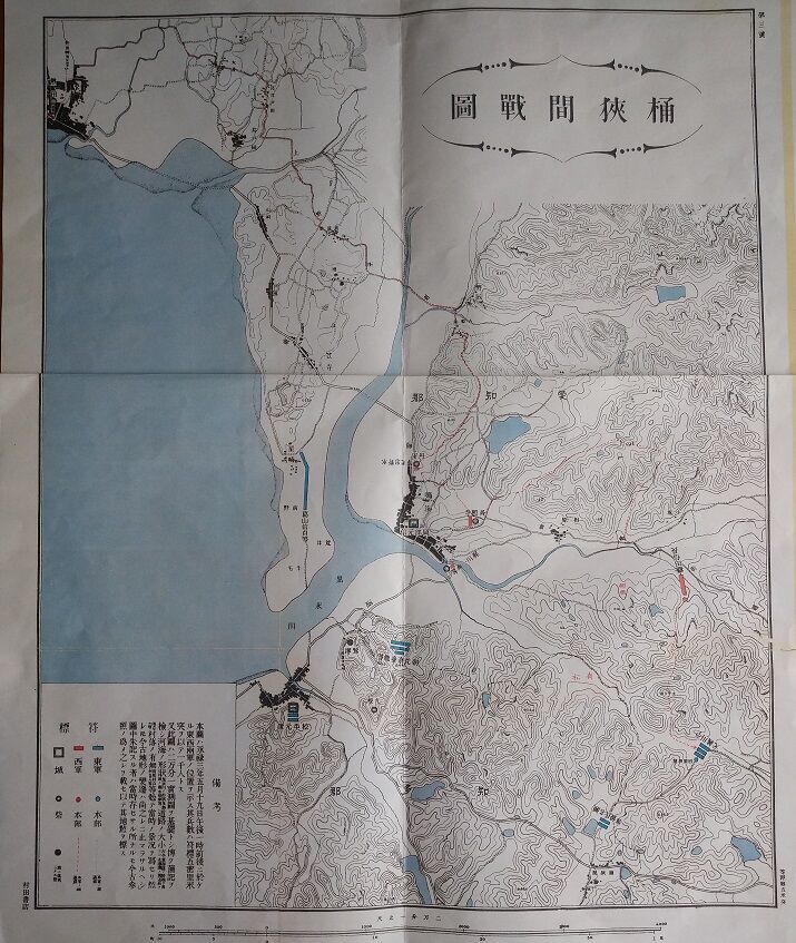 本圖ハ永禄三年五月十九日午後一時前後ニ於ケル東西両軍ノ位置ヲ示ス其兵數ハ符標五蜜里米突ヲ以テ一千人トス・・・